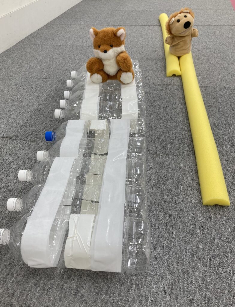 『ペットボトルを使った平均台』では、踏むたびに「べこべこ」と音が鳴り、子どもたちはその音を楽しみながら、足裏に伝わる柔らかく不安定な感触を味わっていました。ゆっくりと慎重に進む姿からは、感覚を確かめながら歩く様子が伝わってきます。